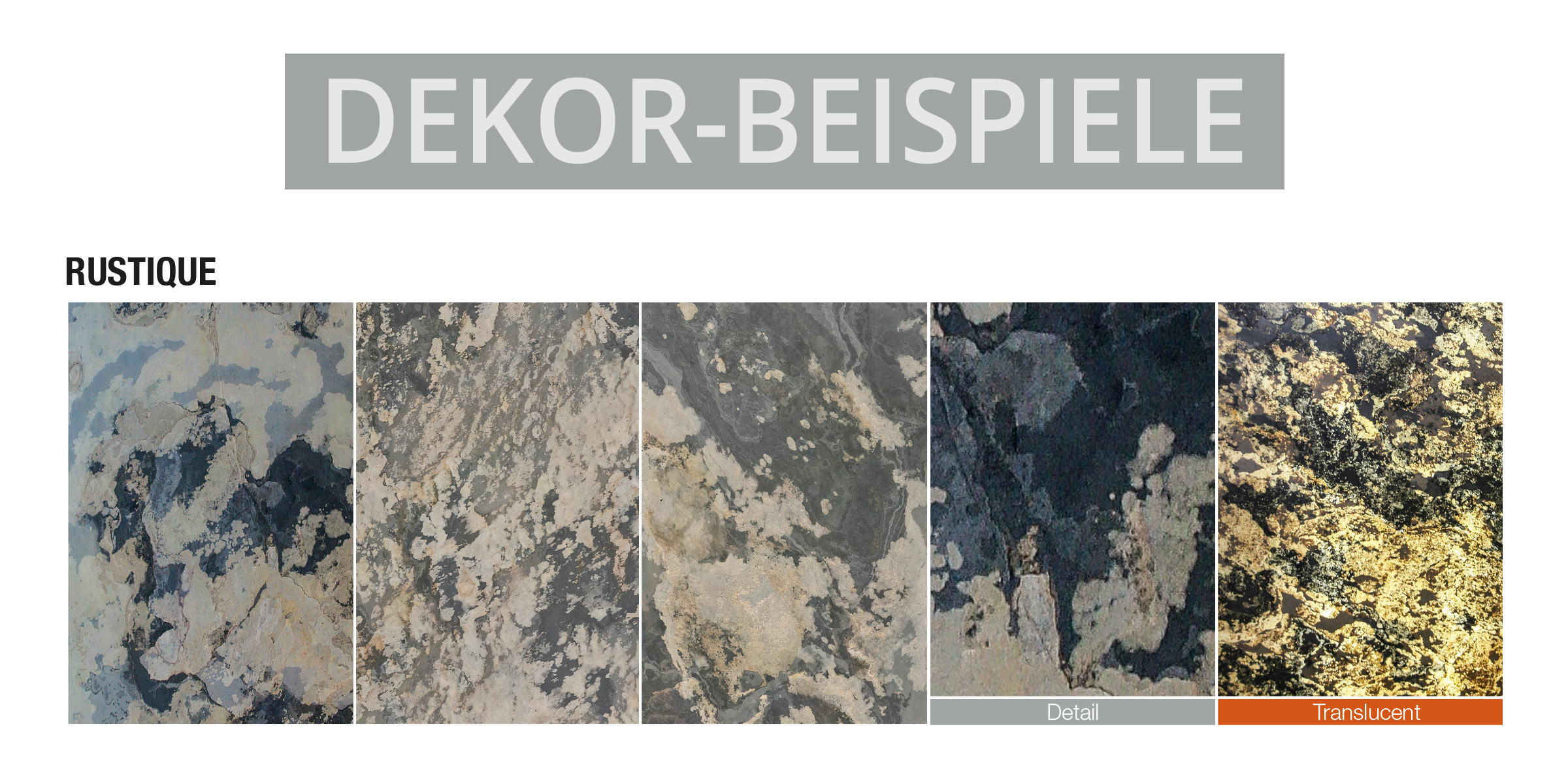 Rustique ist ein Buntschieferdekor mit einer echten Steinoberfläche Der Buntschiefer zeichnet sich durch matte Farben, aber oft sehr stark durchwachsene Verläufe mit blumigen Mustern aus.