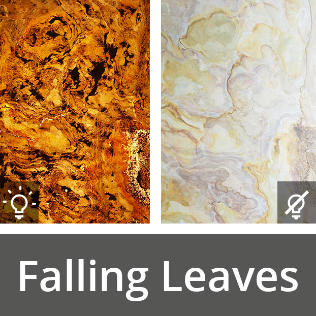 Falling Leaves Luma ist das absolute Designelement, die lichtdurchlässigen Steine verwandelnden jeden Raum in ein einzigartiges Erlebnis der Sinne. Falling Leaves Luma hat dieselben Eigenschaften wie das Classic Material, bis auf die Lichtdurchlässigkeit. Wird das Leuchtmittel hinter dem Falling Leaves Luma ausgeschaltet, wirkt es wie gewöhnlicher Schiefer, wird die Lichtquelle eingeschaltet entstehen einzigartige Musterungen.