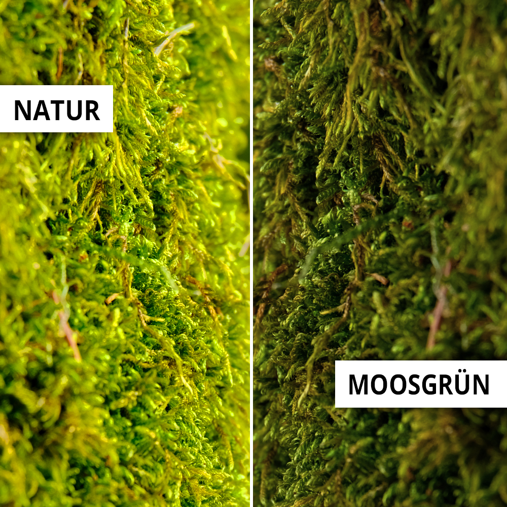Unsere Mooswände und Moosbilder werden aus echten, konservierten Moosen gefertigt. Die Pflanzen werden in einem speziellen und natürlichen Verfahren mit Salzen, Glycerin und Lebensmittelfarbstoff konserviert. Dadurch werden sie pflegefrei und haltbar gemacht. Die Pflanzen benötigen weder Wasser, noch Licht. Einzig und allein müssen die Rahmenbedingungen gesunder Raumluft eingehalten werden. Dem entspricht eine relative Luftfeuchtigkeit zwischen 40 und 60 %. Direkte Sonneneinstrahlung und zu hohe beziehungsweise zu niedrige Luftfeuchtigkeit beeinflussen die Haltbarkeit. Die Moosoberfläche ist antistatisch und zieht daher keinen Staub an.