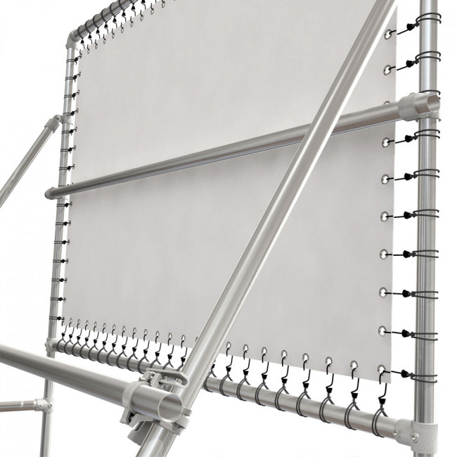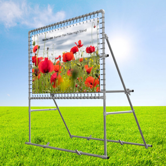 Freistehender Rahmen auf Hochständer. Eine robuste Außenbannersystem aus kräftige 3 mm / Ø 48 mm Aluminium Röhre für Präsentation von PVC-Banners im Großformat.